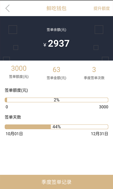 鲜吃是一款朝向追求完美精致生活用户的一款信用消費产品,用户悦享出单吃,一季一结算。