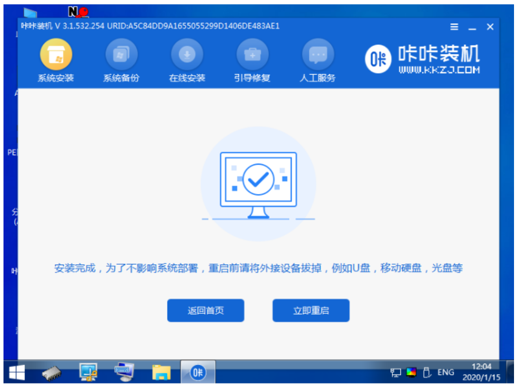 5、在pe系统桌面上点击打开咔咔装机工具,选择系统点击安装。