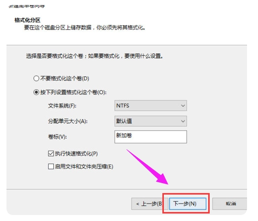 8、在这个界面中,为新建的简单卷选择磁盘的格式,一般默认选择“NTFS”即可,继续“下一步”。
