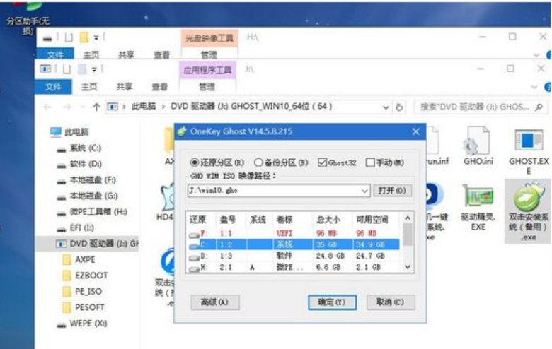 9、双击【双击安装系统.exe】,运行安装工具,选择【还原分区】,GHO WIM ISO映像路径会自动提取到win10.gho,接着选择安装位置,一般是C盘,或者根据卷标或总大小来判断,选择之后,点击确定。