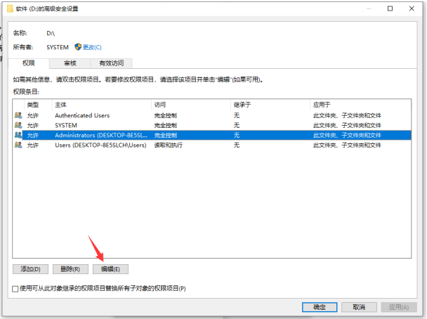 选择权限条目,点击编辑,勾选完全控制,点击确定即可。