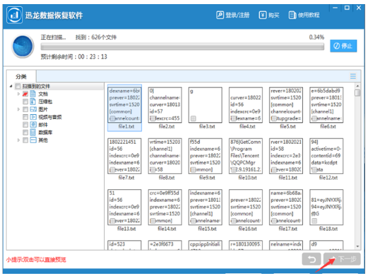 4、等待扫描完成后出现丢失的数据,软件会将其分类,点击左侧对应的文档,压缩包或者图片等。双击还可以预览。选择好之后点击下一步。